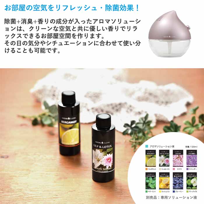 除菌+消臭+香りの成分が入ったアロマソリューションは、天然アロマの香りでクリーンな空気と共に優しい香りがお部屋へほのかに広がります。